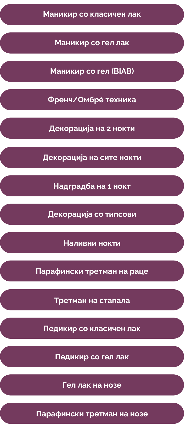 Искусете допир на луксуз со нашите едноставни, но стручни услуги за маникир и педикир. Почестете се со негувани раце и нозе во релаксирачки амбиент – затоа што го заслужувате најдоброто.